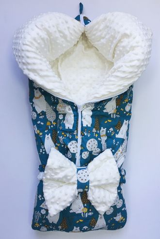 Снаружи это идеальный конверт, красивый, симпатичный глазу, можно использовать на выписку, нарядно украшен бантом, который может в дальнейшем использоваться, как мини-подушка для крохи. Конверт на удобном замке, который легко свернуть и развернуть в одеяло! Внутри мягкий и нежный плюш.