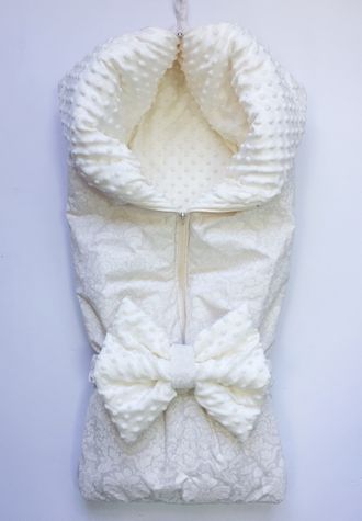 Снаружи это идеальный конверт, красивый, симпатичный глазу, можно использовать на выписку, нарядно украшен бантом, который может в дальнейшем использоваться, как мини-подушка для крохи. Конверт на удобном замке, который легко свернуть и развернуть в одеяло! Внутри мягкий и нежный плюш.