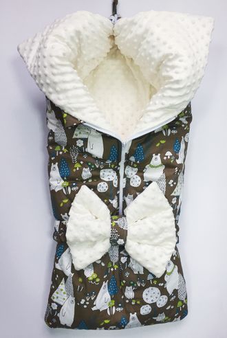 Снаружи это идеальный конверт, красивый, симпатичный глазу, можно использовать на выписку, нарядно украшен бантом, который может в дальнейшем использоваться, как мини-подушка для крохи. Конверт на удобном замке, который легко свернуть и развернуть в одеяло! Внутри мягкий и нежный плюш.