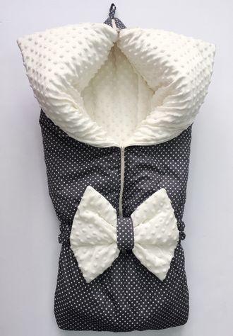 Снаружи это идеальный конверт, красивый, симпатичный глазу, можно использовать на выписку, нарядно украшен бантом, который может в дальнейшем использоваться, как мини-подушка для крохи. Конверт на удобном замке, который легко свернуть и развернуть в одеяло! Внутри мягкий и нежный плюш.