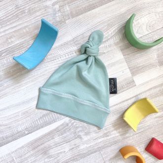 Шапочка с узелком выполнена их трикотажного хлопка, который подходит нежной коже новорожденного, не вызывает аллергии и дарит малышу комфорт.